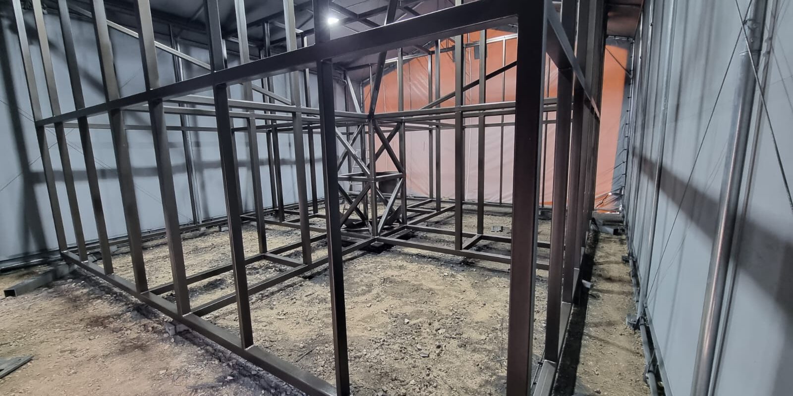Derzeit wird der Korrosionsschutz auf die Bauelemente (Kabinettes in der Größe 96 mal 96 cm) aufgetragen. Das ist für eine langjährige Haltbarkeit wichtig. Der Pylon bekommt einen Anstrich in schwarz-anthrazit, der Standfuß wird, passend zur Halle, in Graualuminium gestaltet. Zudem werden schon die einzelnen LED-Elemente ausgerichtet und befestigt. Es sind Kabinettes in der Größe von 96 mal 96 cm, insgesamt fast 60 Stück.